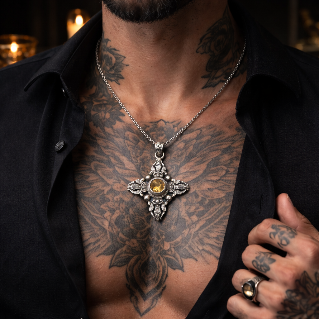 Sa structure en croix ornementale, inspirée des symboles anciens, entoure une citrine naturelle facettée, pierre de protection et d’élévation spirituelle.