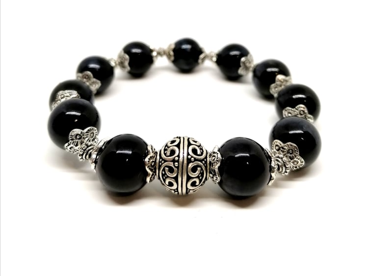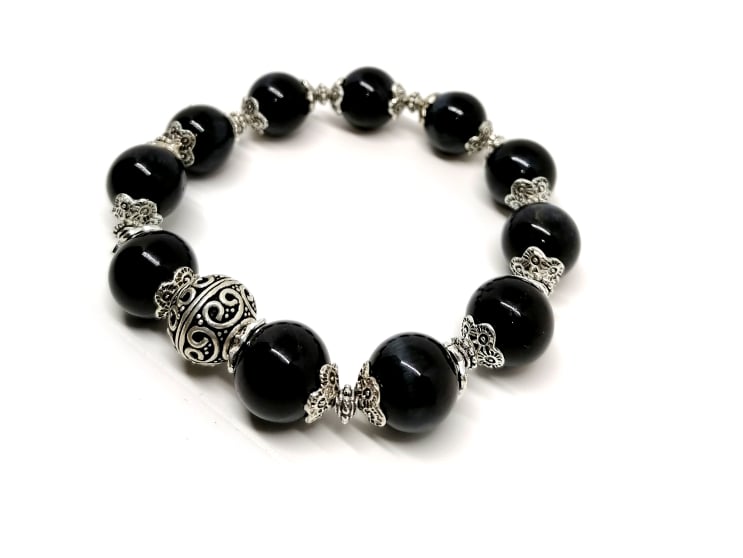 Le bracelet Ange gardien est composé d'oeil de faucon associés à une perle Balinaise centrale en argent Sterling 925 et une multitude de coupelles et de séparateurs en argent Sterling 925.