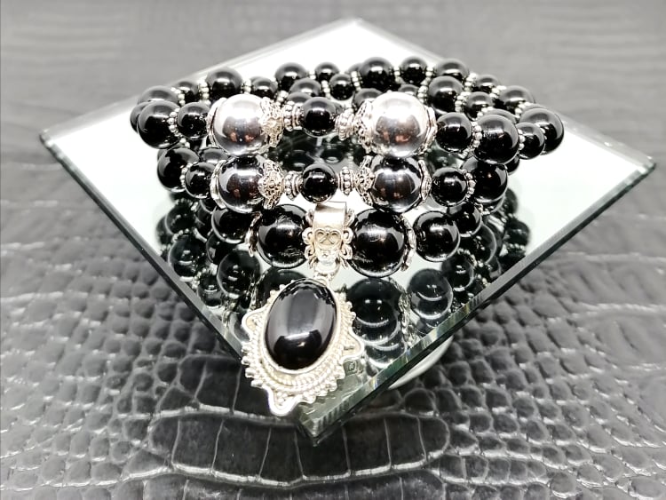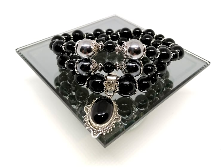 La Comtesse des Ténèbres est un superbe triple bracelet en onyx et en hématite, accompagné de coupelles et de 47 séparateurs en argent Sterling, avec un pendentif incrusté d'onyx et en argent Sterling 925.
